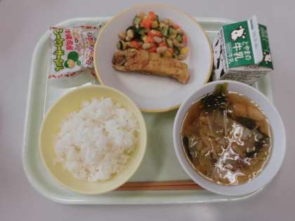 今日の給食は、ごはん、牛乳、魚のカレー揚げ またはハムチーズフライ、甘みそ和え、具だくさん汁、ソーダゼリー または シークワーサータルトです。