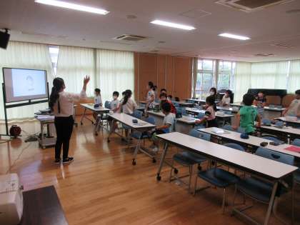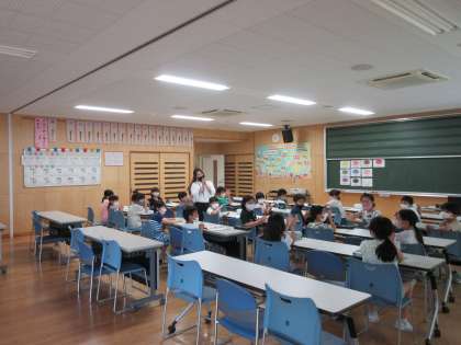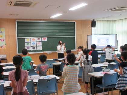 ALTと外国語の学習をしました。リズムにのりながら、英語で自分の好きな色やスポーツを表現しました。