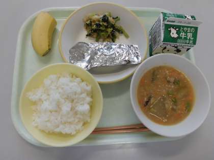 今日の給食は、ごはん・牛乳・とうがんのそぼろあん・ごまあえ・さばのぎんがみやき・バナナです。さばのぎんがみ焼きはごはんとの相性ばっちりでした。