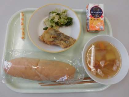 今日の給食は、米粉コッペパン・オレンジシュース・ポテトスープ・アスパラサラダ・ホキのフリッター・ぼうチーズです。ポテトスープはじゃがいもがほくほくでおいしかったです。オレンジシュースもこどもたちに人気でした。