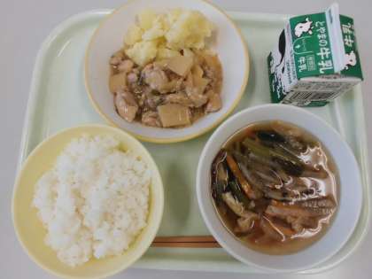 今日の給食は、ごはん、あっさりチキン、こふきいも、沢煮椀、牛乳です。