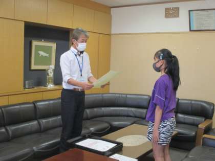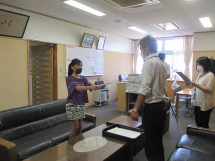 校長室で受賞伝達式を行いました。陸上の大会で素晴らしい結果を残してくれました。おめでとうございます。
