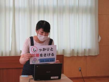 始業式の後、養護教諭からコロナウイルス感染症対策についての話を聞きました。