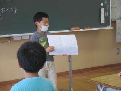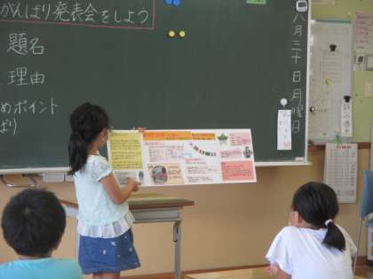 夏休みにがんばって取り組んだ「一人一研究」の発表会をしました。「オリンピックについて」「速く走るようになるための研究」「嫌いな野菜で料理を作ろう」などなど、いろいろなテーマがあり、子供たちは友達の発表を興味深く聞き、たくさん質問が出ていました。