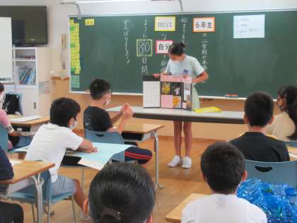 夏休みに取り組んだ自由研究について発表会をしました。子供たちは、取り組もうと思った理由や研究して分かったこと等を話したり、友達の発表を真剣に聞いたりしました。夏休みの頑張りがよく伝わってきました。
