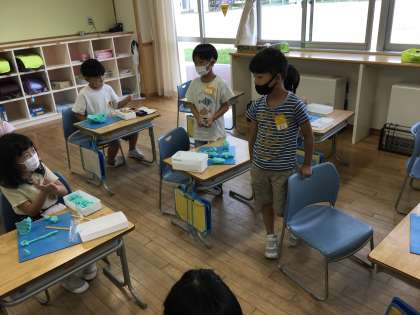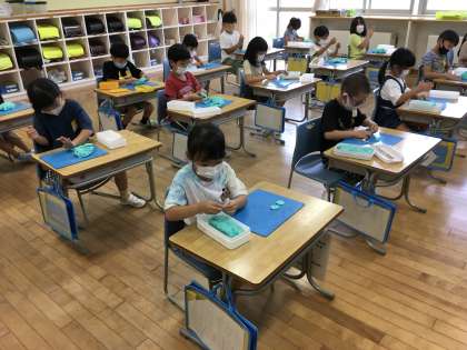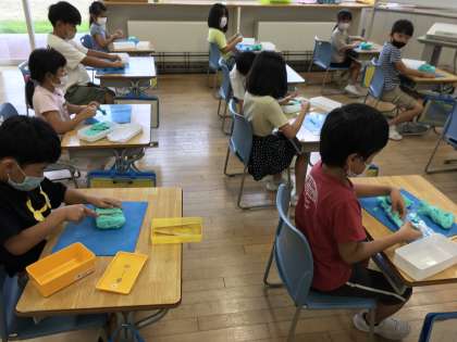 図工でいろいろな食べ物を作りました。お寿司やくだものなど美味しそうな食べ物をねんどで上手に作ることができました。