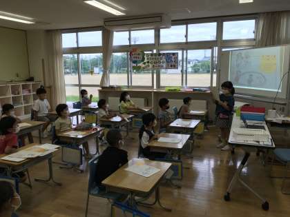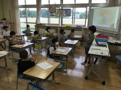 国語の学習で、夏休みの思い出を発表しました。タブレットで絵日記の写真を撮り、友達に紹介するなど、少しずつタブレットの操作に慣れてきています。