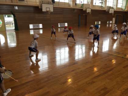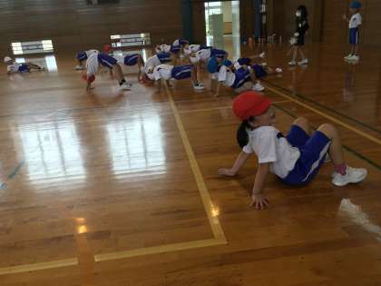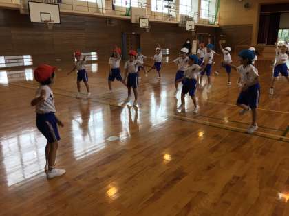 体育で表現運動をしました。友達の動きを真似したり、いろいろな動物になりきったりしながら楽しく体を動かしました。