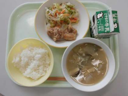 今日の給食は、ごはん、とりにくのこめこ揚げ、コールスローサラダ、なすのみそ汁、牛乳です。