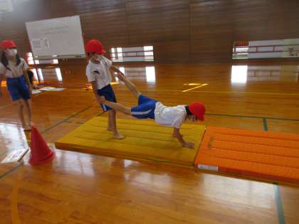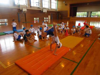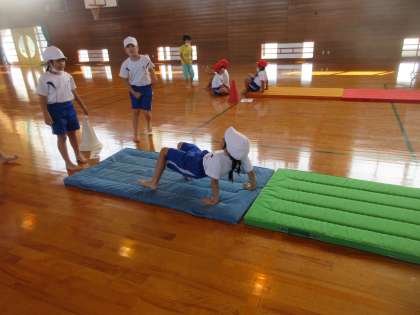 今日のマットあそびは、いろいろな動物や道具に変身しました。「手押し車」「くも歩き」「川跳び」「丸太ころがし」等。手をしっかり着いたり、足を高く上げたりすることに気を付け、思い思いにマットに親しみました。