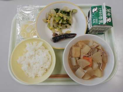 今日の給食は、ごはん、大根の味噌煮込み、いわしのしょうがあじ、コーンあえ、冷凍パイン、牛乳です。
