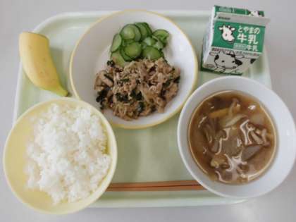 今日の給食は、ごはん、豚肉のキムチいため、きゅうりもみ、くきわかめスープ、バナナ、牛乳です。
