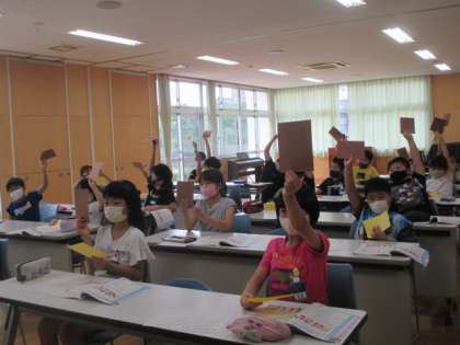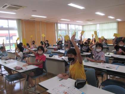 音楽科の学習で「ファランドール」の鑑賞をしました。「王の行進」「馬のダンス」の2つの旋律の特徴を話し合った後、かけ合いや重なりに気を付けて聴きました。教科書の絵譜を見たり、曲に合わせて体を動かしたり、2つのカードを使ったりして、曲のよさを味わうことができました。