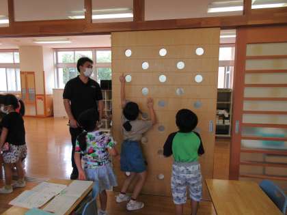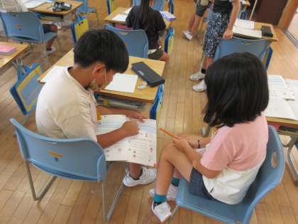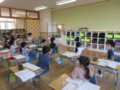 算数の学習で1〜20の数字を探しました。教室のロッカーや扉の穴の数など、身近にある数を丁寧に数えました。1,2,3,や2,4,6,8,のように数えるなど、いろいろな数え方を試していました。