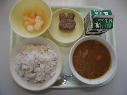 今日の給食は、麦ごはん・カレー・うさぎがたハンバーグ・フルーツしらたま・牛乳です。今日は待ちに待ったお月見献立です!カレーもハンバーグもしらたまも好評でした。うさぎがたハンバーグはかわいくて食べるのもったいないですね。