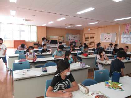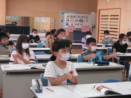 富山の民謡「こきりこ」の踊りを見てまねしています。ほかにも、日本各地の伝統的な音楽に親しみました。