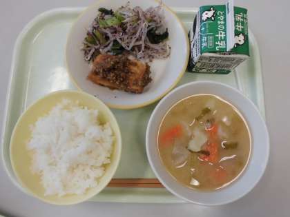 今日の給食は、ごはん、牛乳、揚げ出し豆腐のごまだれかけ、ゆかり和え、みそ汁です。