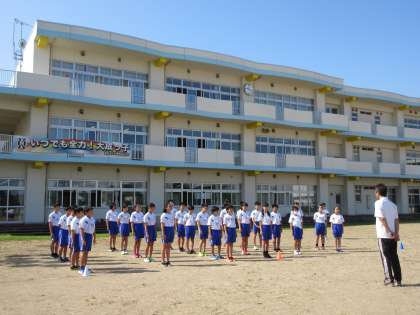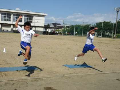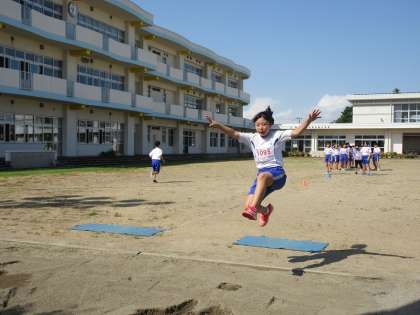 校内チャレンジ陸上記録会を行いました。開会式と走り幅跳びの様子です。練習の成果を発揮し、一人一人がベストを尽くして頑張りました。