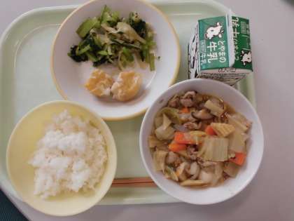 今日の献立は、ごはん、牛乳、八宝菜、にんじんシューマイ、小松菜ひたしです。