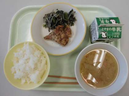 今日の給食は、ごはん、ぶたにくの香り揚げ、よごし、つみれ汁、牛乳です。