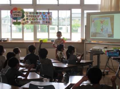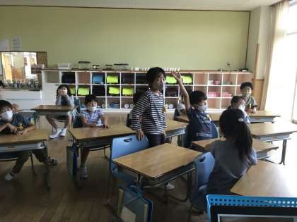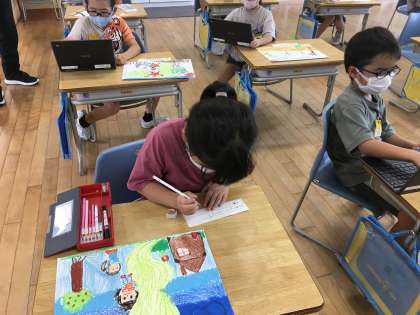 図工の学習で読んだことのあるお話の絵を描きました。今日はみんなの作品をお互いに観て、いいところを伝え合う活動をしました。空の色合いや人の描き方などいろいろないいところを見付けることができました。