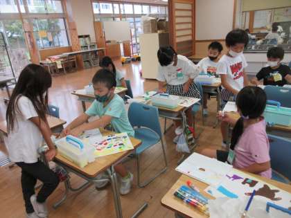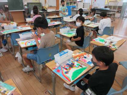 製作に取り組んでいる「ふしぎなたまご」。今日は,背景に絵の具で色をつ好きな色を好きな色の濃さを工夫して着色していきました。仕上がりが楽しみです。