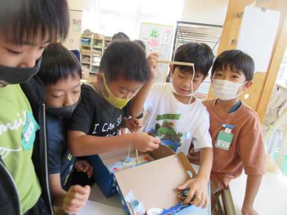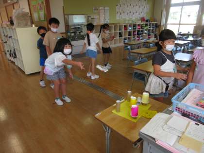 ミニゲーム係さんたちが、輪投げや迷路、魚釣りを家で作り、ゲームコーナーを教室に設置しました。休憩のときに、みんなで遊んで楽しんでいます。ゲームに参加したら、名前シールが貼られ、係の子供たちが紹介してくれるという工夫もすてきです。