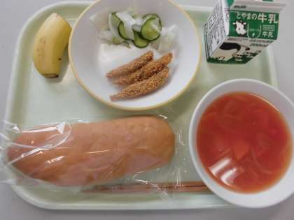 今日の給食は、こめこコッペパン・牛乳・トマトスープ・かぶのサラダ・きびなごのさくさくあげ・バナナです。きびなごは献立の名前のとおりサクサクで、おいしかったです。トマトスープはトマトの酸味がきいていてさっぱりしていました。