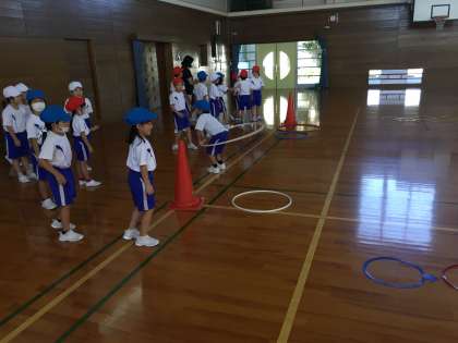 体育の学習でリレーをしました。リレーの途中でけんけんぱをしたり、フラフープ跳びをしたりして楽しく活動しました。