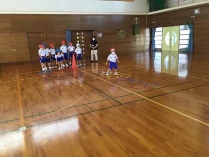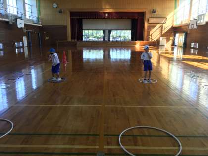 体育の学習でリレーをしました。リレーの途中でけんけんぱをしたり、フラフープ跳びをしたりして楽しく活動しました。