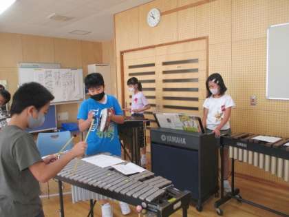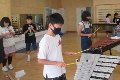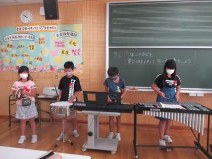 音楽科の学習では、見合わせていた合唱や合奏の練習を再開しています。5年生は、団ごとにグループ合奏に取り組んでいます。全員で合わせるだけでなく、いろいろな重ね方を工夫し、音色や響きの違いを感じ取っていました。