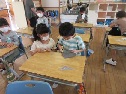 算数では、形を切り取り折り曲げて、直角を見つける学習をしました。子供たちは、目を輝かせながら、新しい三角定規を早速使っていました。
