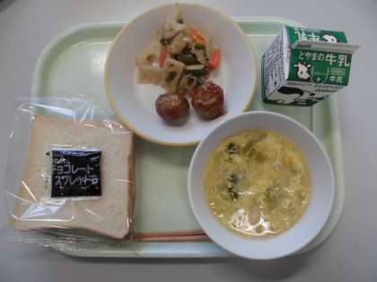 今日の給食は、食パン、ミートボールの照り焼き、れんこんソテー、卵コーンスープ、チョコレートクリーム、牛乳です。