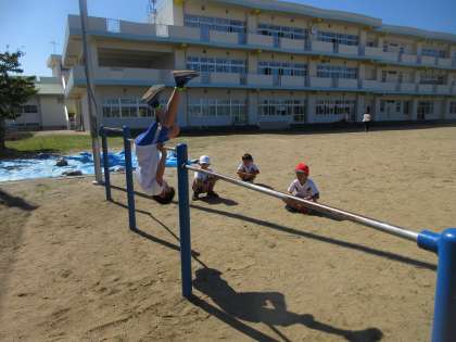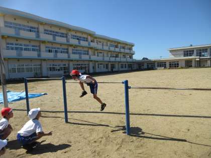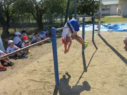 今日は、今まで練習してきた鉄棒の技を一人一人発表しました。子供たちは、お互いの技のよいところを見つけたり、がんばれと声援を送り合ったりしていました。