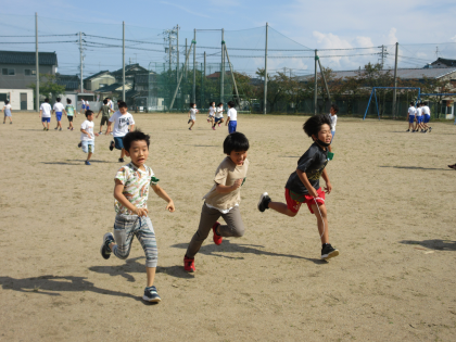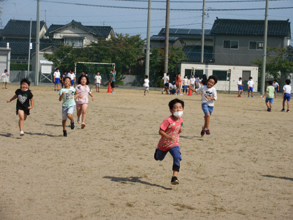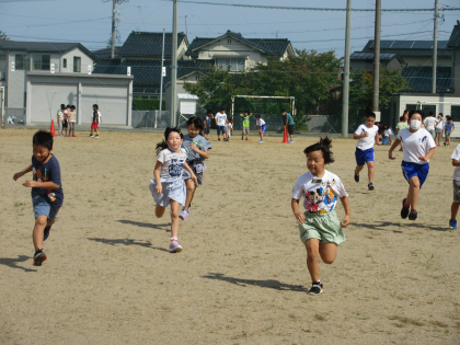 今日のトレーニングタイムは全校で50m走をしました。晴れた天気の下で、子供たちはゴールに向かって全力疾走していました。