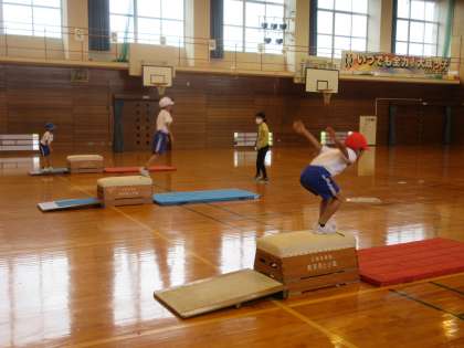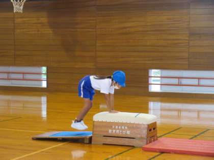 今日は、今年度初めての跳び箱運動。準備の仕方やルールを確認し、跳び箱に「手つき跳び乗り」をする運動を行いました。跳び乗った後は,思い切りジャンプをして着地。久しぶりの跳び箱を楽しみました。