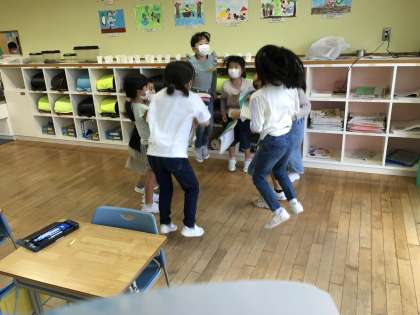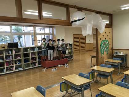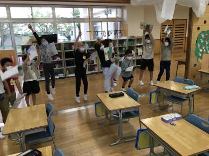 国語の学習でくじらぐもを音読しました。くじらぐもや登場する子供になりきって体を動かしながら楽しく学習しました。