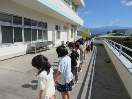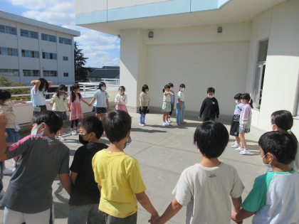 国語科では「ちいちゃんのかげおくり」を学習しています。晴れた日の今日は、ちいちゃんが遊んでいた「かげおくり」をみんなでやってみました。自分の影を見つめ、10数えた後に空を見上げると、「空にみんなの影が見えた」と喜んでいました。平和な青空の下、子供たちはきらきらとした笑顔でかげおくりを楽しんだようです。