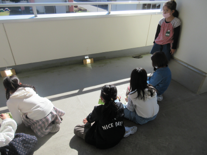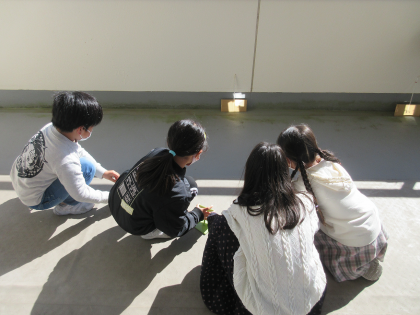 理科の実験で、鏡ではね返した日光が当たったところの温度を調べました。子供たちは鏡を調節して日光を温度計に当て、温度の上がり方を観察しました。