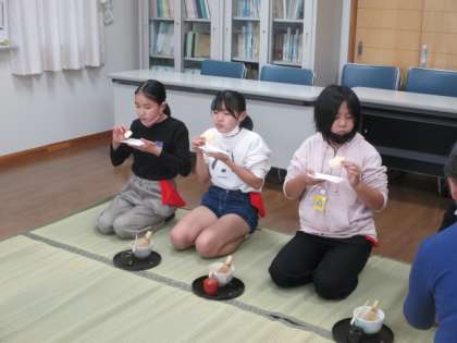 理科実験クラブ(上)、スポーツクラブ(中)、茶道クラブ(下)の様子です。