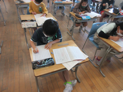 今日の国語では、これまで「ちいちゃんのかげおくり」を読んで、思ったことや感じたことを原稿用紙に書き表しました。戦争の時代を生きたちいちゃんへの思いや平和への願いなど、たくさん書きたいことがあったようで、原稿用紙いっぱいに表現していました。
