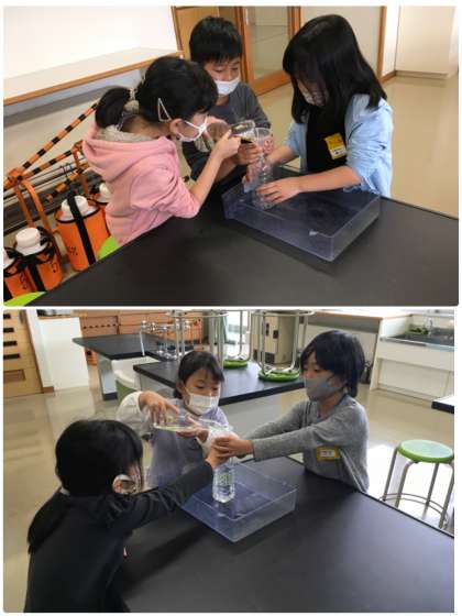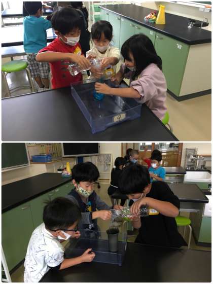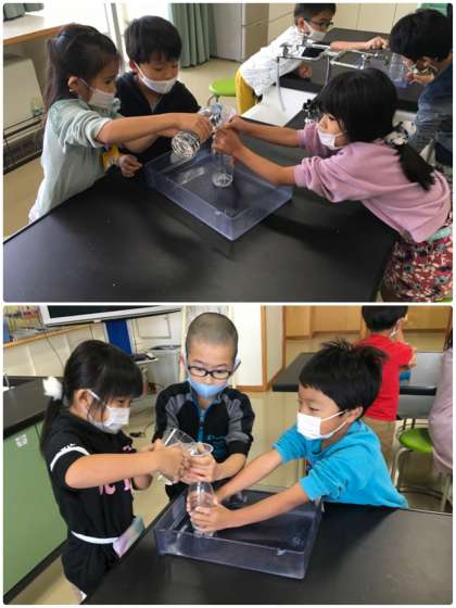 算数の学習で、ペットボトル等の水の量を比べました。今日はペットボトルから容器へと水を直接移し替えて、どちらが多いかを確かめました。グループで協力しながら仲良く活動していました。