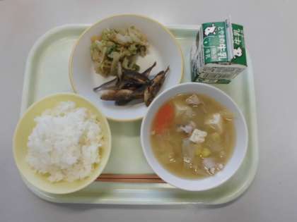 今日の給食は、ごはん・牛乳・さつまじる・ごまあえ・こあじの唐揚げです。さつまじるはさつまいもが入っていて秋を感じました。こあじの唐揚げは丸ごと揚げてあるので、カルシウムたっぷりです。