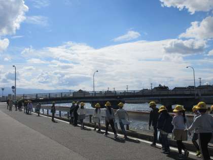 最後は,白岩川沿いを探検して帰りました。海の波が,川を逆上っていたのに驚いていました。最後は水神社に寄って帰校しました。