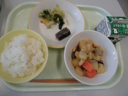 今日の給食は、ごはん・牛乳・ちくぜんだき・しょうがひたし・さんまのマーマレード煮です。さんまは「魚の薬」と呼ばれるほど、体によい栄養がたくさん含まれています。今日の給食では、さんまをマーマレードで煮てあるので食べやすいですね。