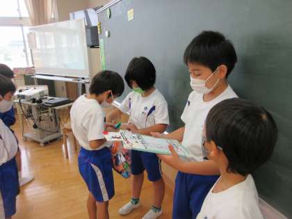 体育係が、朝の会で、休み時間や放課後にがんばっている運動を自己紹介する時間をとっています。今日は、発表した友達に、折り紙の景品を渡しました。
