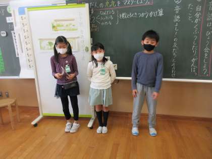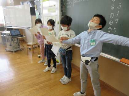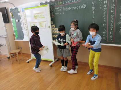 以前から、グループごとに練習してきた「お手紙」の音読を発表しました。各グループで、読み方や動きを工夫していました。友達のがんばりを見つけ、紹介し合い、すてきな発表会になりました。