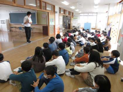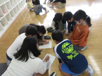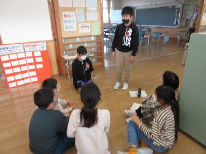 宿泊学習の班を発表して、当日のめあてや係を決めました。4・5年生の仲を深めていこう。
