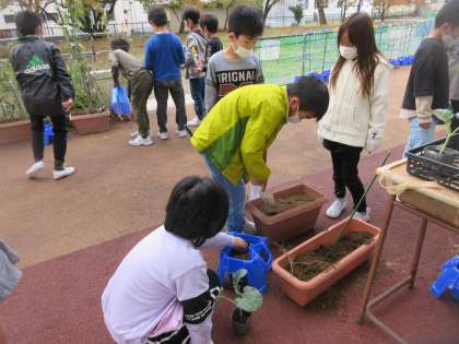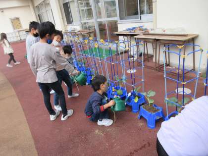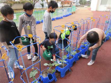 子供たちは、登校するとすぐに「昨日植えたブロッコリーは、どうなったのかな?」と水やりに飛んでいきました。水を根元にやったり、土が少なすぎたと土を増量したりする様子が見られ、夏野菜を育てた経験を生かしていることが感じられ、とても嬉しく思いました。