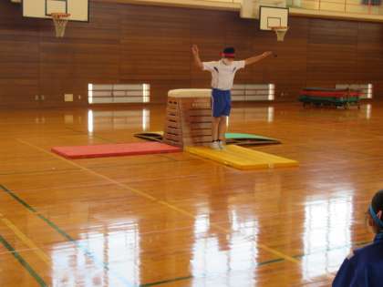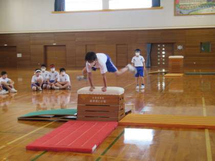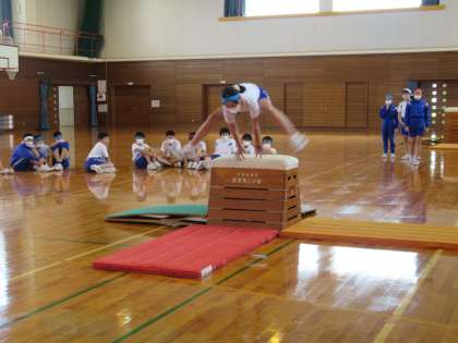 今日は、跳び箱運動の発表会でした。手をつく位置や足の開き方、着地の仕方等に気をつけて跳びました。「今まで跳べなかった段が跳べるようになったよ」「できなかった技ができるようになったよ」と言いながら、練習の成果を発揮していました。